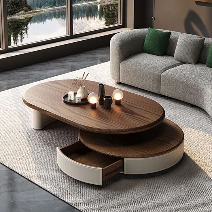 Modern oval coffee table with a stylish two-tier design, combining a rich wood grain top with a contrasting base. Features a hidden drawer and lower shelf for practical storage of everyday items. Built with sturdy construction and smooth finishes, it offers both functionality and a contemporary aesthetic, making it a perfect centerpiece for elegant living rooms.