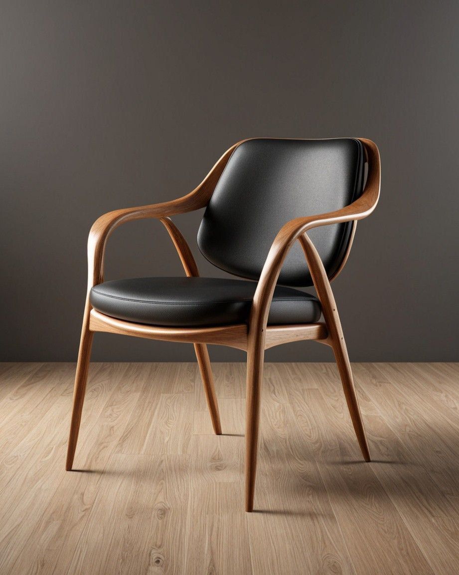 Modern solid wood armchair with a sleek curved frame and ergonomic design. Features a smooth natural wood finish combined with a comfortable padded seat and backrest in black upholstery. Sturdy, stylish, and ideal for dining rooms, living spaces, or office use, offering both durability and refined elegance.